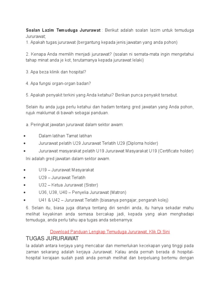 Senarai tugas jururawat terlatih (u29) 1. Menerima dan membuat laporan yang tepat 18. Jururawat masyarakat gred u19 juruteknik perubatan gred u19 pembantu pembangunan masyarakat gred s19 Panduan menjadi jururawat masyarakat u19. Pautan kepada laman web syarikat disediakan dalam senarai.